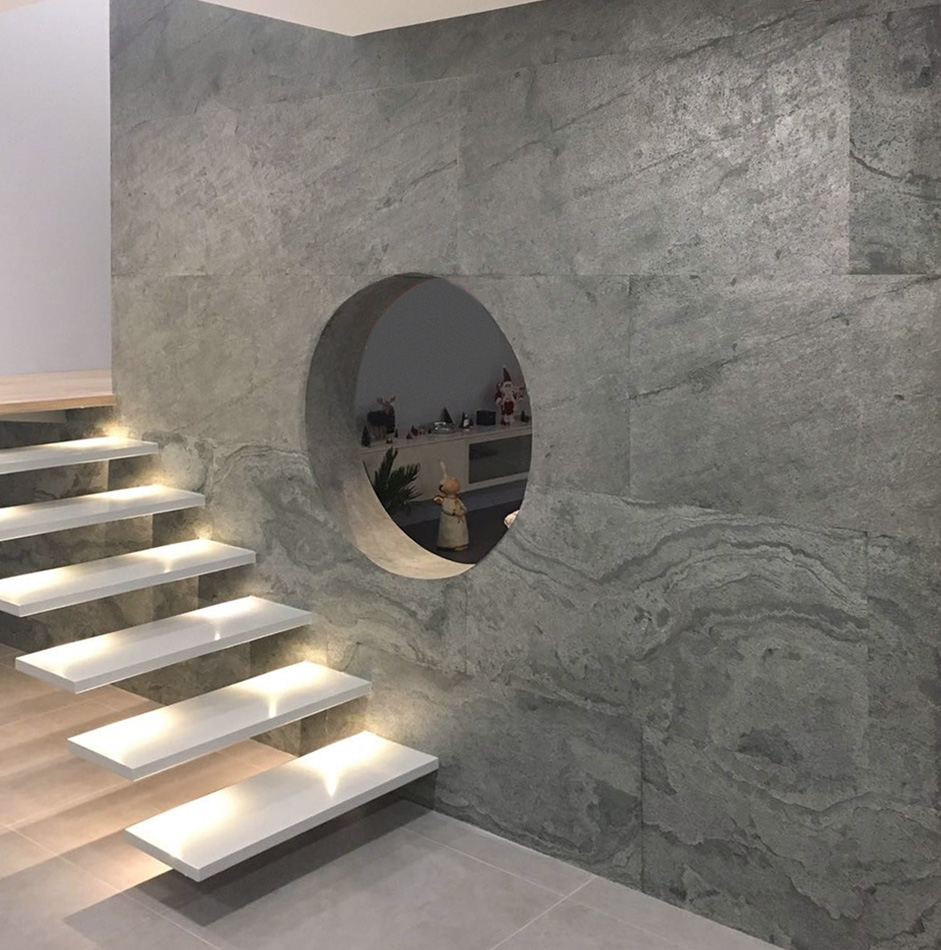 La surface de la pierre naturelle est renforcée par un substrat en fibre de verre foncé, ce qui rend le panneau composite EchtStein extrêment robuste. Il est aussi bien utilisé comme revêtement de sol et de mur à l’intérieur comme à l’extérieur ainsi que pour le revêtement de meuble de haute qualité et pour les zones humides.