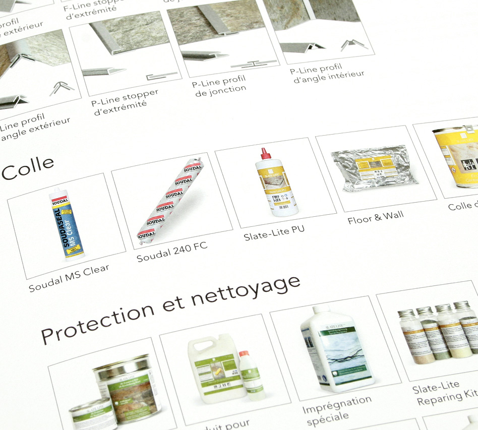 Différentes colle et bandes profilées sont disponibles pour le façonnage. Différents produits sont également disponible pour la protection et le nettoyage des surfaces en pierre.