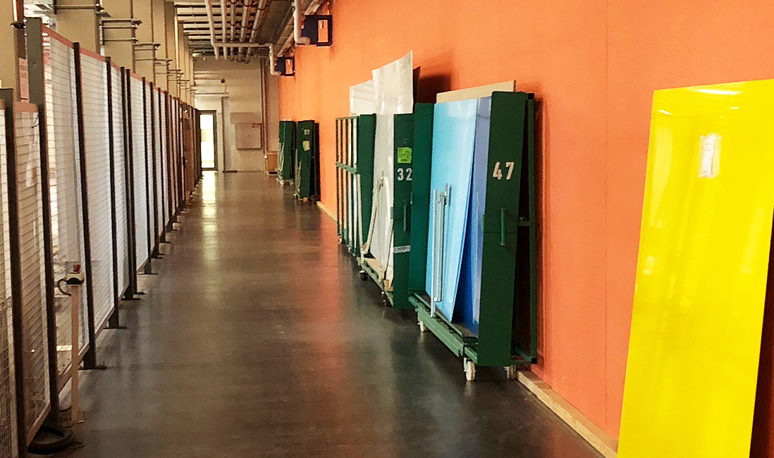 Pour livrer rapidement et en toute sécurité les panneaux à nos clients, nous avons conçu un système intelligent. Les modules découpés sont placés très inclinés sur un chariot spécial (comme pour le transport de plaques de verre) et sont livrés lors d’un processus d’échange.